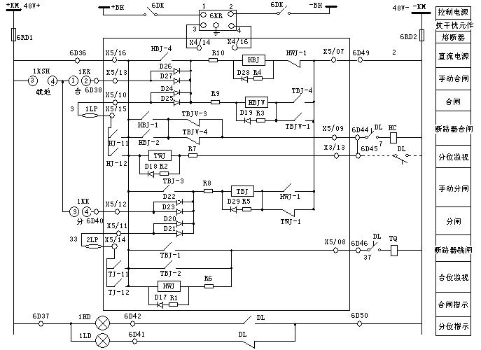 +KM → X5/16 → TBJ-1(TBJ-2)→ X5/08 → TQ線圈 → -KM,從而啟動(dòng)斷路器跳閘線圈TQ,實(shí)現(xiàn)了手動(dòng)跳閘。