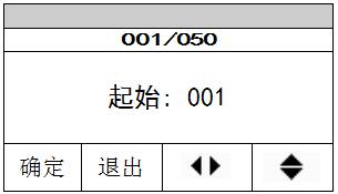 打印之前您需要設(shè)置需打印數(shù)據(jù)的起始序號和結(jié)束序號,使用“”鍵在序號的各位之間切換,使用“”鍵改變各位的數(shù)字大小,設(shè)置完成后按“確定”鍵確認。