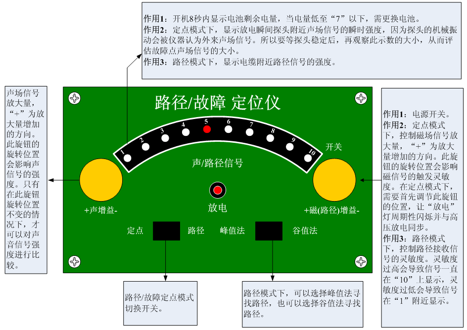 步驟2 將“定點(diǎn)/路徑”模式開關(guān)切換到“路徑”模式然后打開路徑/故障定位儀的電源開關(guān),開機(jī)8秒內(nèi)顯示電池電量(電量低于“7”時(shí)需更換電池?。?/span>