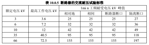 在斷路器合閘及分閘狀態(tài)下進(jìn)行交流耐壓試驗時:當(dāng)在合閘狀態(tài)下進(jìn)行時,試驗電壓應(yīng)符合表 10.0.5 的規(guī)定。當(dāng)在分閘狀態(tài)下進(jìn)行時,真空滅弧室斷口間的試驗電壓應(yīng)按產(chǎn)品技術(shù)條件的規(guī)定,試驗中不應(yīng)發(fā)生貫穿性放電。