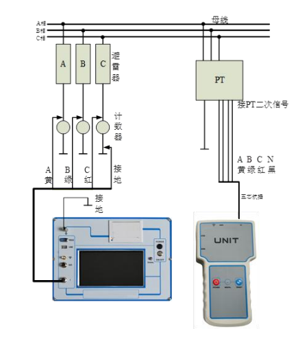 測試線接線方法如圖 3 所示,請先接主機電流線(航插 4 芯引出 4 根線),接入主機航插,再接黑線到計數(shù)器下端地線,然后分別按黃綠紅顏色線接入 A、B 、C 相避雷器下端計數(shù)器上端。再接單元的電壓線(航插 5 芯引出 4 根線),接入單元航插,再接 PT 二次測量端,分別按黃綠紅黑顏色線接入二次側(cè)測量端的 A、B、C、O,一定要小心謹慎接線以避免 PT 二次或試驗電壓短路。