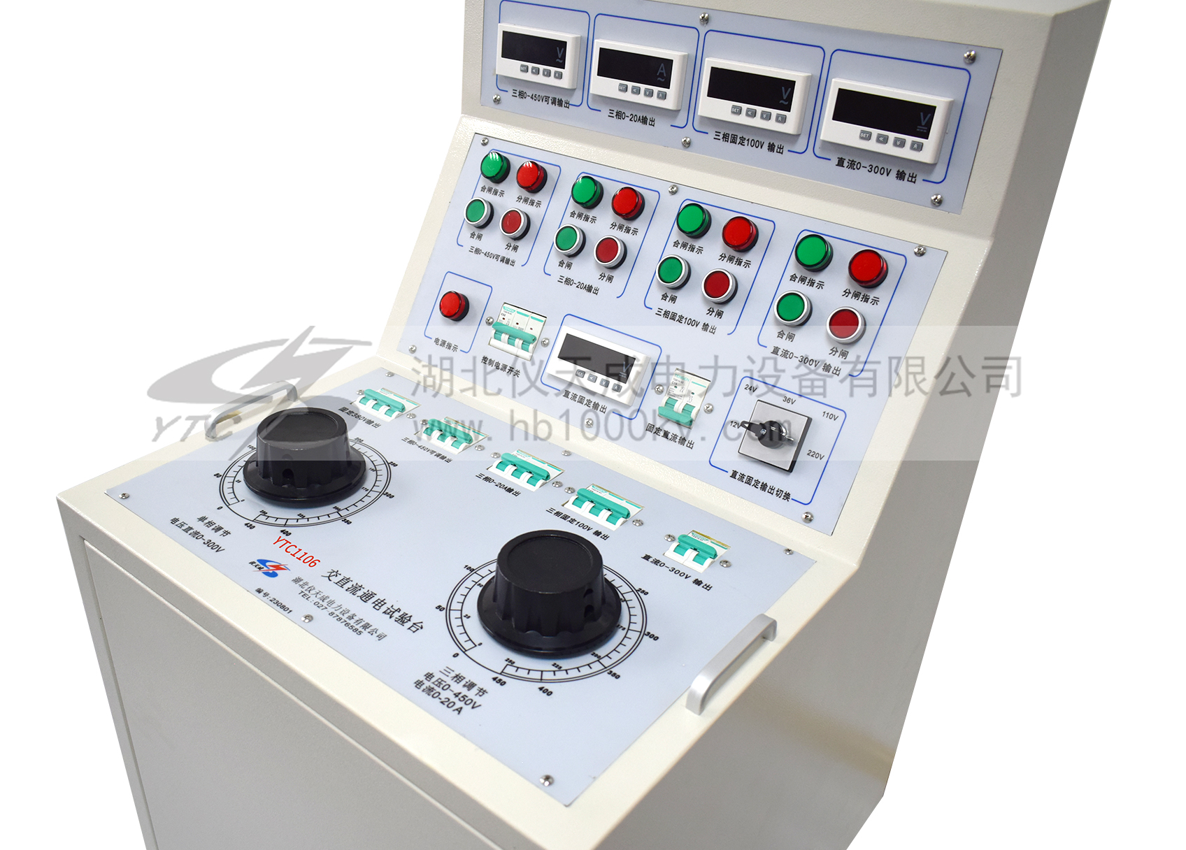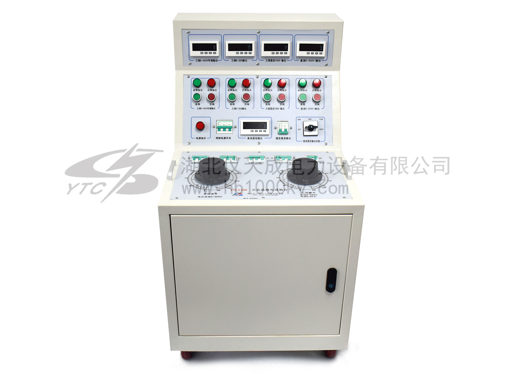 YTC1106系列高低壓開關(guān)柜通電試驗(yàn)臺(tái)用于高低壓開關(guān)柜生產(chǎn)廠家對(duì)所生產(chǎn)的高低壓開關(guān)柜進(jìn)行出廠前的各項(xiàng)通電試驗(yàn)。它能提供各種交、直流電源,便于對(duì)開關(guān)柜的檢測(cè),提高工作效率。