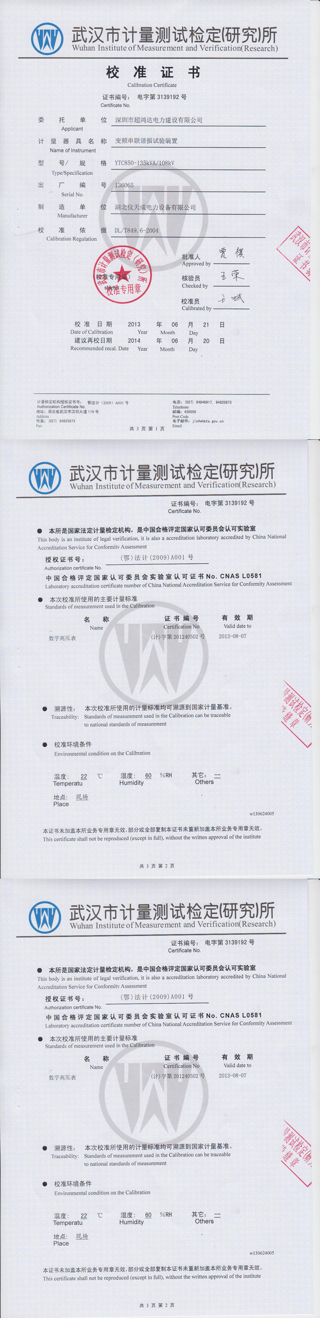 YTC850系列變頻串聯(lián)諧振試驗(yàn)裝置資質(zhì)證書(shū)