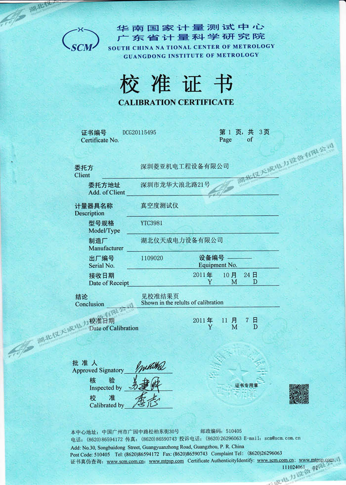 轉(zhuǎn)載:"YTC3981真空度測(cè)試儀的資質(zhì)證書(shū)" 請(qǐng)注明來(lái)源于儀天成電力。 更多技術(shù)問(wèn)題請(qǐng)致電儀天成電力客戶服務(wù):027-87876585,技術(shù)部專(zhuān)線:027-87876585,在線客服:719388481